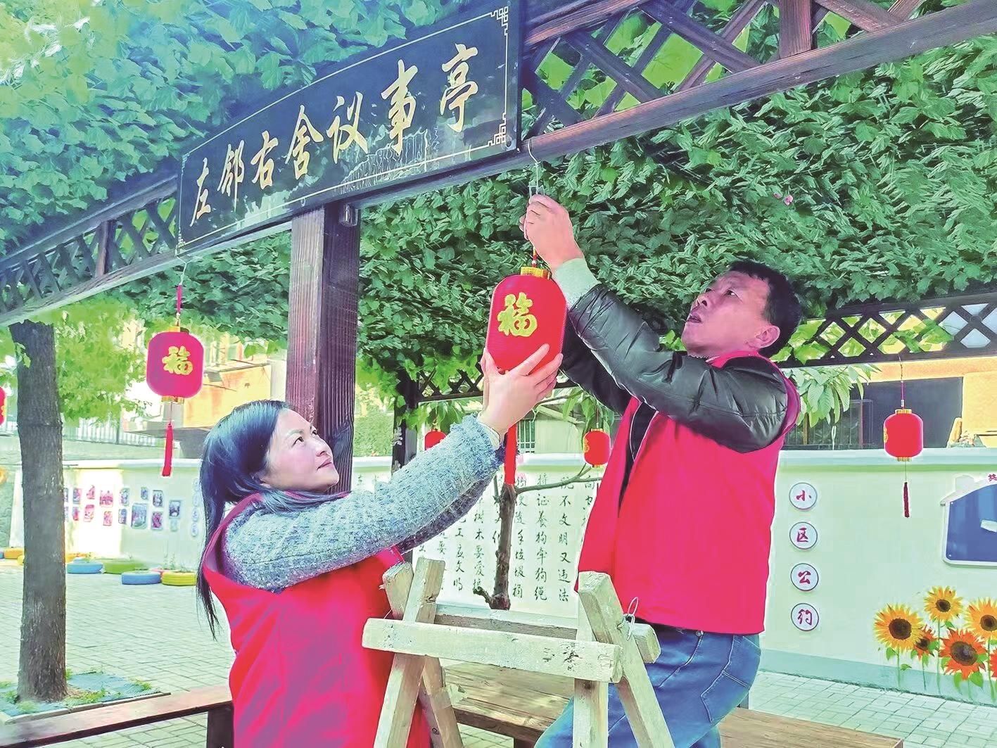 鐵山街道新村社區(qū)新時代文明實踐站組織志愿者在轄區(qū)掛燈籠迎新年。