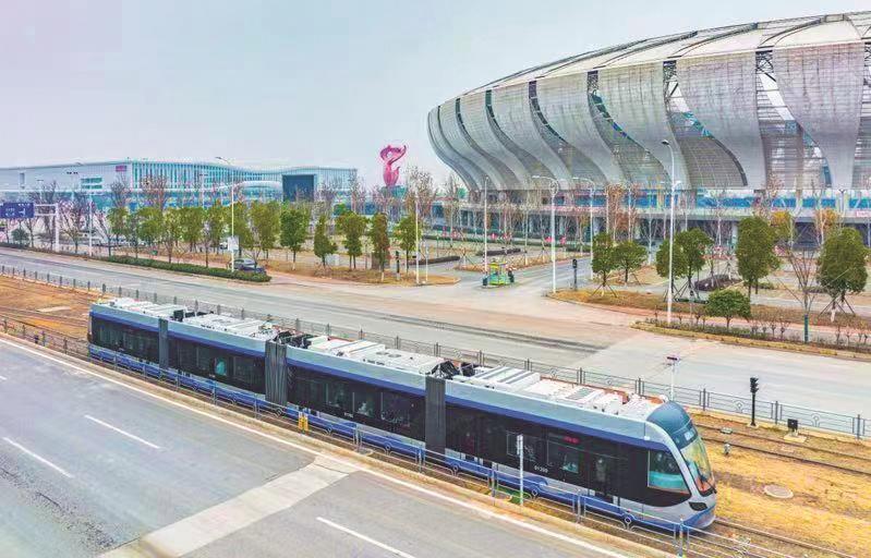 黃石城市有軌電車駛過大冶湖新區(qū)奧體中心。