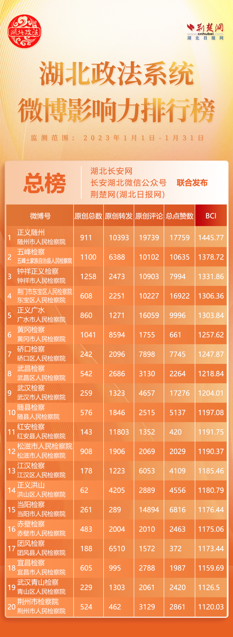 湖北政法系統(tǒng)495個(gè)官方微博賬號參加評選,政法委系統(tǒng)10個(gè)、法院系統(tǒng)98個(gè)、檢察系統(tǒng)130個(gè)、公安系統(tǒng)244個(gè)、司法系統(tǒng)13個(gè)。 “黃岡檢察”、“紅安檢察”、“團(tuán)風(fēng)檢察”3家單位上榜,分別排名第6位、第11位、第17位。