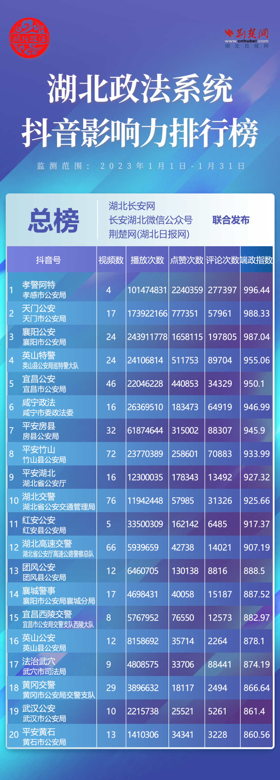 湖北政法系統(tǒng)370個(gè)抖音帳號參加評選,其中政法委系統(tǒng)82個(gè)、法院系統(tǒng)52個(gè)、檢察系統(tǒng)8個(gè)、公安系統(tǒng)195個(gè)、司法系統(tǒng)33個(gè)?!坝⑸教鼐?、“紅安公安”、“團(tuán)風(fēng)公安”、“英山公安”、“法治武穴”、“黃岡交警”6家單位強(qiáng)勢上榜,分別排名第4位、11位、13位、16位、17位、18位。
