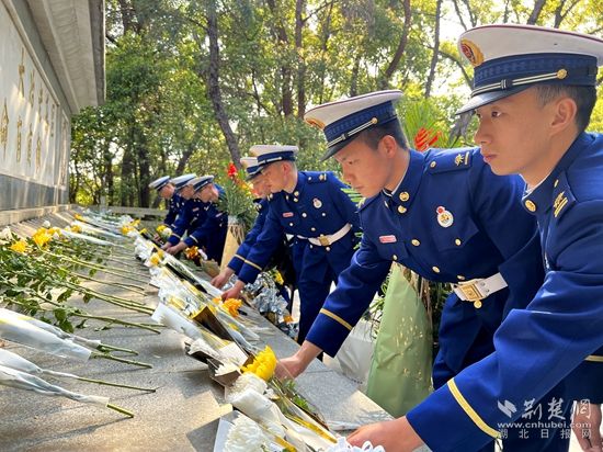 在大冶市青龍山烈士紀念碑前,消防員向烈士敬獻鮮花,拂去烈士紀念碑上的輕塵并集體鞠躬默哀,深切表達對革命先烈的敬仰、哀思之情。全體消防救援人員嚴正肅穆,認真聆聽每一句紅色故事、感悟每一個場景,從先烈們艱苦卓絕的凜然斗志和英雄慷慨的氣魄中,汲取新時代“火焰藍”的奮進力量。