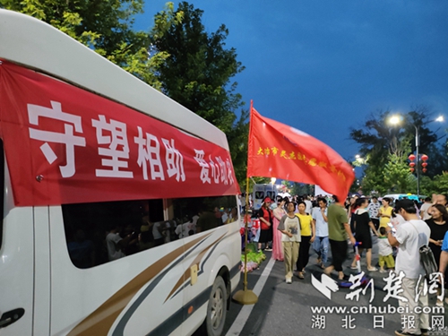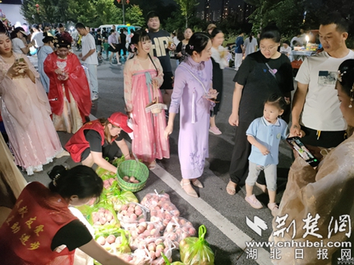 當(dāng)天下午六點(diǎn),大冶市靈杰國(guó)風(fēng)志愿服務(wù)隊(duì)兵分兩路,分別在恒達(dá)歡樂(lè)大世界和雨潤(rùn)廣場(chǎng)將農(nóng)戶的桃子一袋袋的分揀好,早早地將夜市攤擺上,為了讓路人能直觀看到桃子的品質(zhì),他們將散裝桃子一個(gè)個(gè)切好給來(lái)往的行人品嘗。