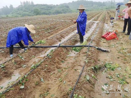 荊楚網(wǎng)(湖北日報網(wǎng))訊(通訊員毛紅平)6月25日,天空下著蒙蒙細雨,紅安縣永佳河鎮(zhèn)沙河村帥家河塆河畈地1000畝連片基地上,150多位村民正穿著雨衣,飛快地搶栽紅苕苗。