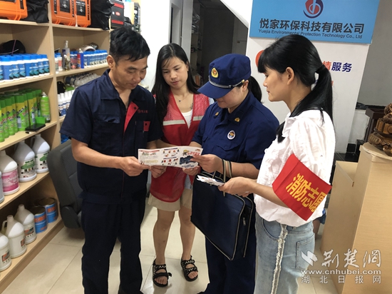 在西塞山區(qū),消防人員走進(jìn)沿街門(mén)面開(kāi)展消防安全檢查宣傳?!疤鞖庋谉?,用電量劇增,請(qǐng)不要私拉亂接線路、超負(fù)荷用電,要經(jīng)常檢查線路敷設(shè)是否完好?!毕廊藛T一邊檢查,一邊提醒商戶要經(jīng)常開(kāi)展消防隱患自查自改,同時(shí)要熟練掌握滅火器、消火栓等器材使用方法。下陸區(qū)消防救援大隊(duì)結(jié)合夏季高溫防火特點(diǎn),整合戶外大屏、社會(huì)單位LED屏幕等社會(huì)資源循環(huán)播放夏季防火提示公告、高溫防火提示,提醒廣大人民群眾規(guī)范用火、用氣、用電。