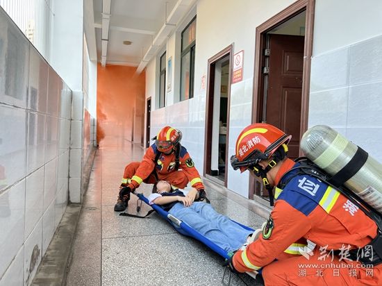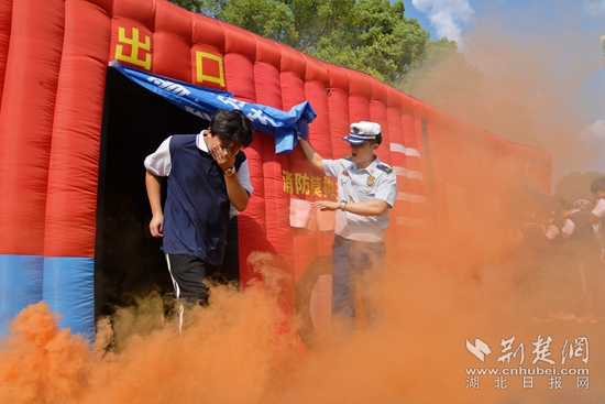 伴隨著陣陣緊促的警笛聲在校園響起,一教室內(nèi)“電線短路”,引燃桌面書籍,頓時(shí)濃煙滾滾。“請(qǐng)各位同學(xué)不要驚慌,捂住口鼻、低頭彎腰、貼墻往樓下有效進(jìn)行疏散......”廣播中傳來疏散指令,消防員指導(dǎo)全體師生從“安全出口”有序迅速撤離,通過體驗(yàn)“生命通道”,使師生掌握火場(chǎng)疏散逃生技能。