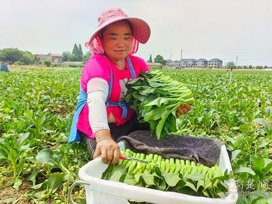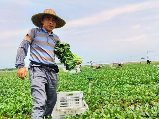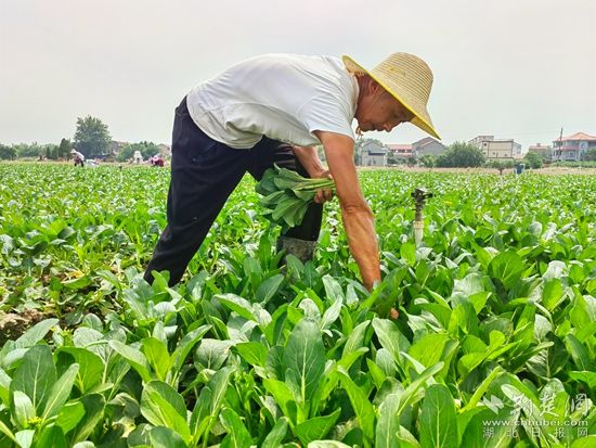 在黃梅縣分路鎮(zhèn)鼎旺農業(yè)農民專業(yè)合作社廣東菜心種植基地,近100名割菜工手戴指甲刀,在技術顧問呂美標的指揮下,分散到各個地塊,不一會兒,路兩旁就整齊堆滿了菜心,合作社社長石成旺拿出手機聯(lián)系車輛,經(jīng)過整理、清洗,剛收割的菜心就被送到凍庫,準備第二天運往國內外。