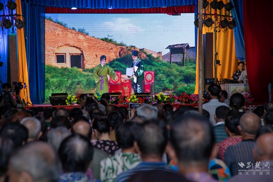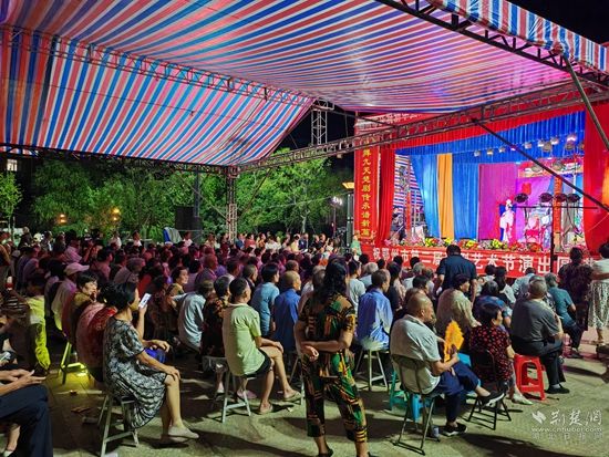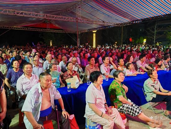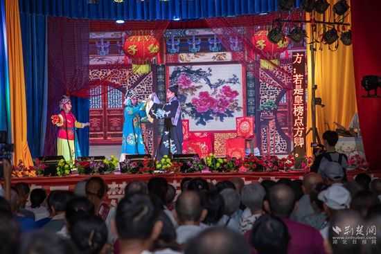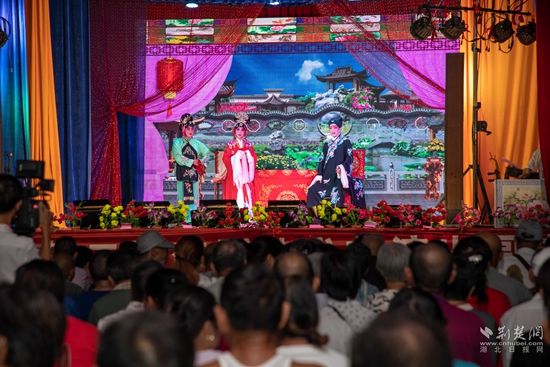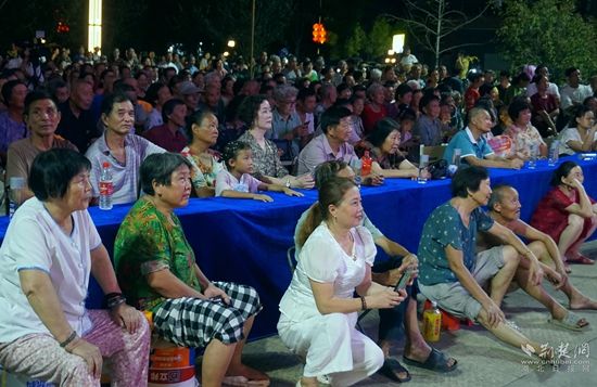 當(dāng)晚7點(diǎn),廣場(chǎng)上人聲鼎沸、鑼鼓喧天、座無(wú)虛席,來自周邊村鎮(zhèn)的老百姓偕老扶幼聚集于此,共襄楚劇盛會(huì)。