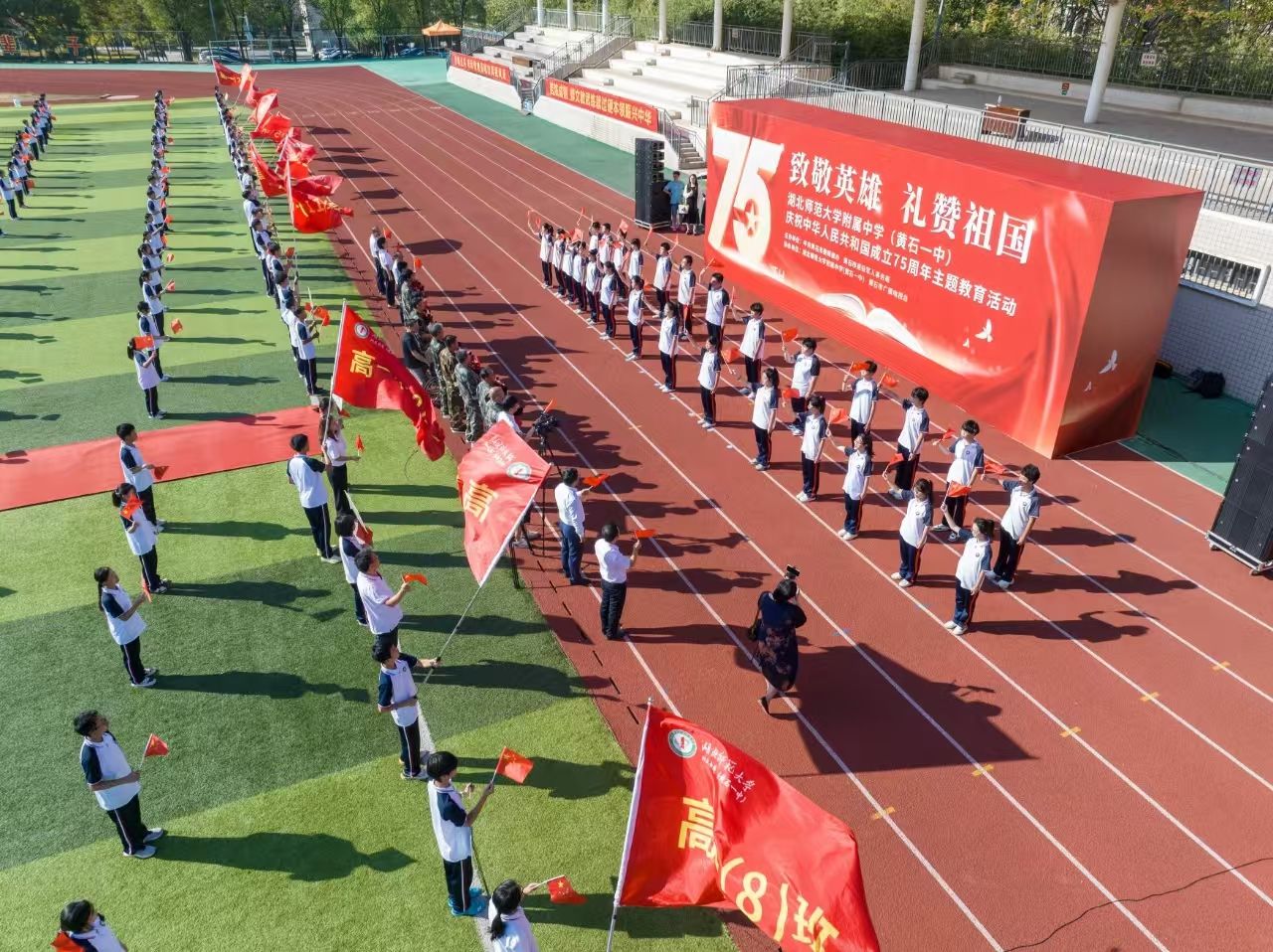 9月29日上午,國慶節(jié)臨近,“致敬英雄 禮贊祖國”——湖北師范大學附屬中學(黃石一中)慶祝中華人民共和國成立75周年活動舉行?;顒油ㄟ^走一次紅地毯、唱一首主題歌、獻一束手捧花、送一本報道集等形式,致敬為共和國無私奉獻的英雄們。
