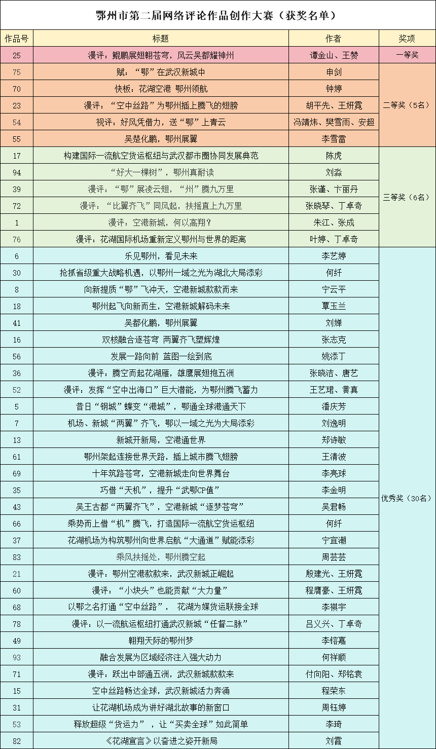 荊楚網(wǎng)(湖北日報網(wǎng))訊(記者陶輝 通訊員陳穩(wěn)定)10月23日,鄂州市第二屆主題網(wǎng)評大賽獲獎名單出爐,42件作品分別獲得一、二、三等獎和優(yōu)秀獎。