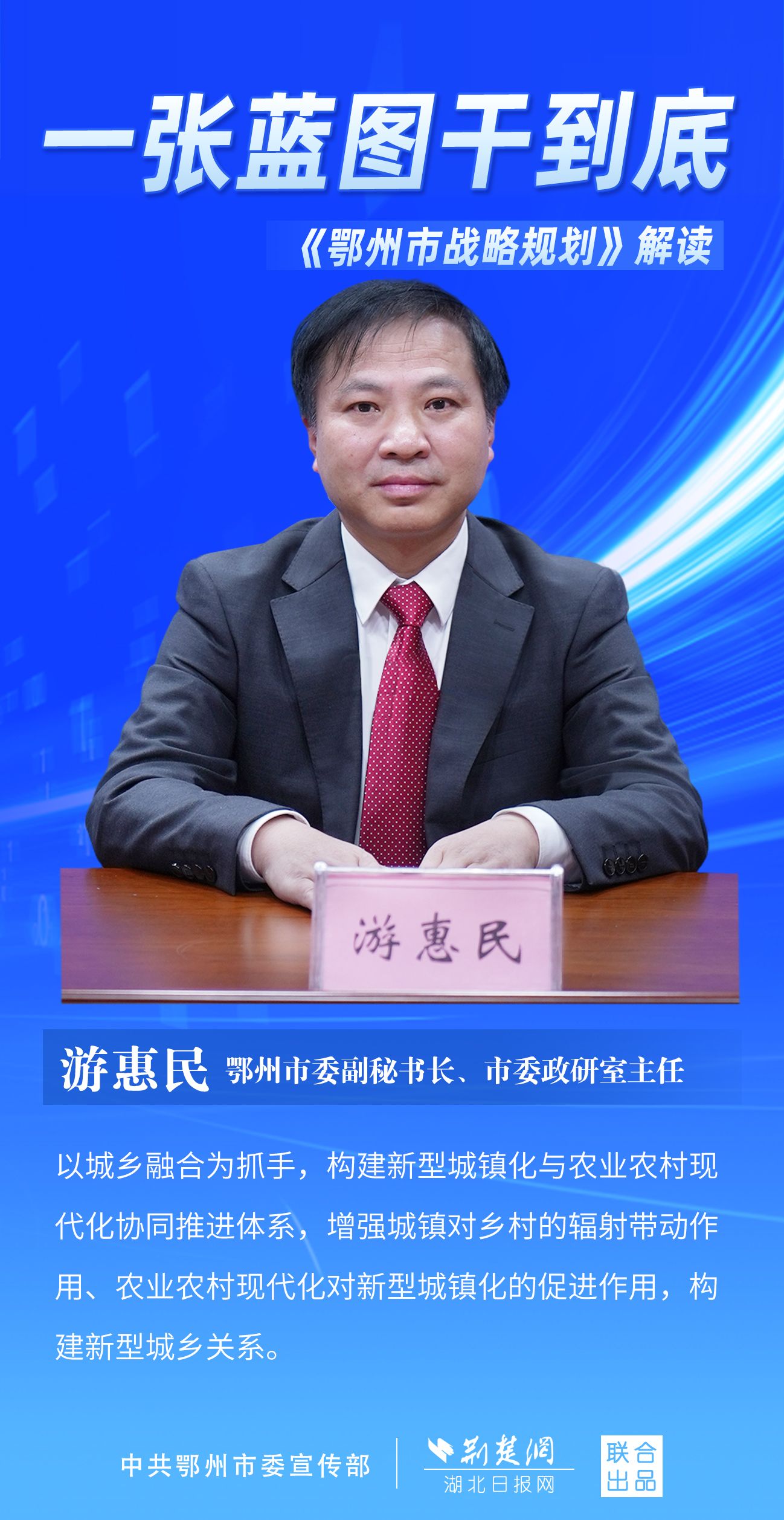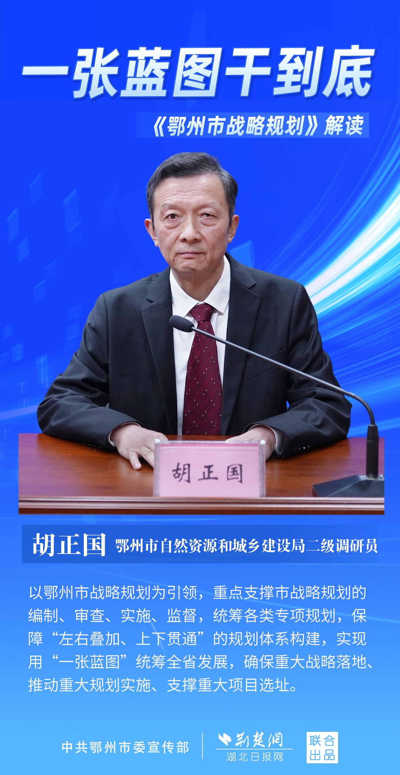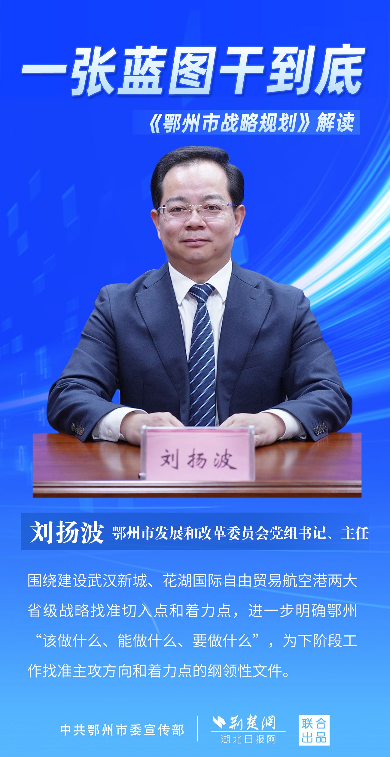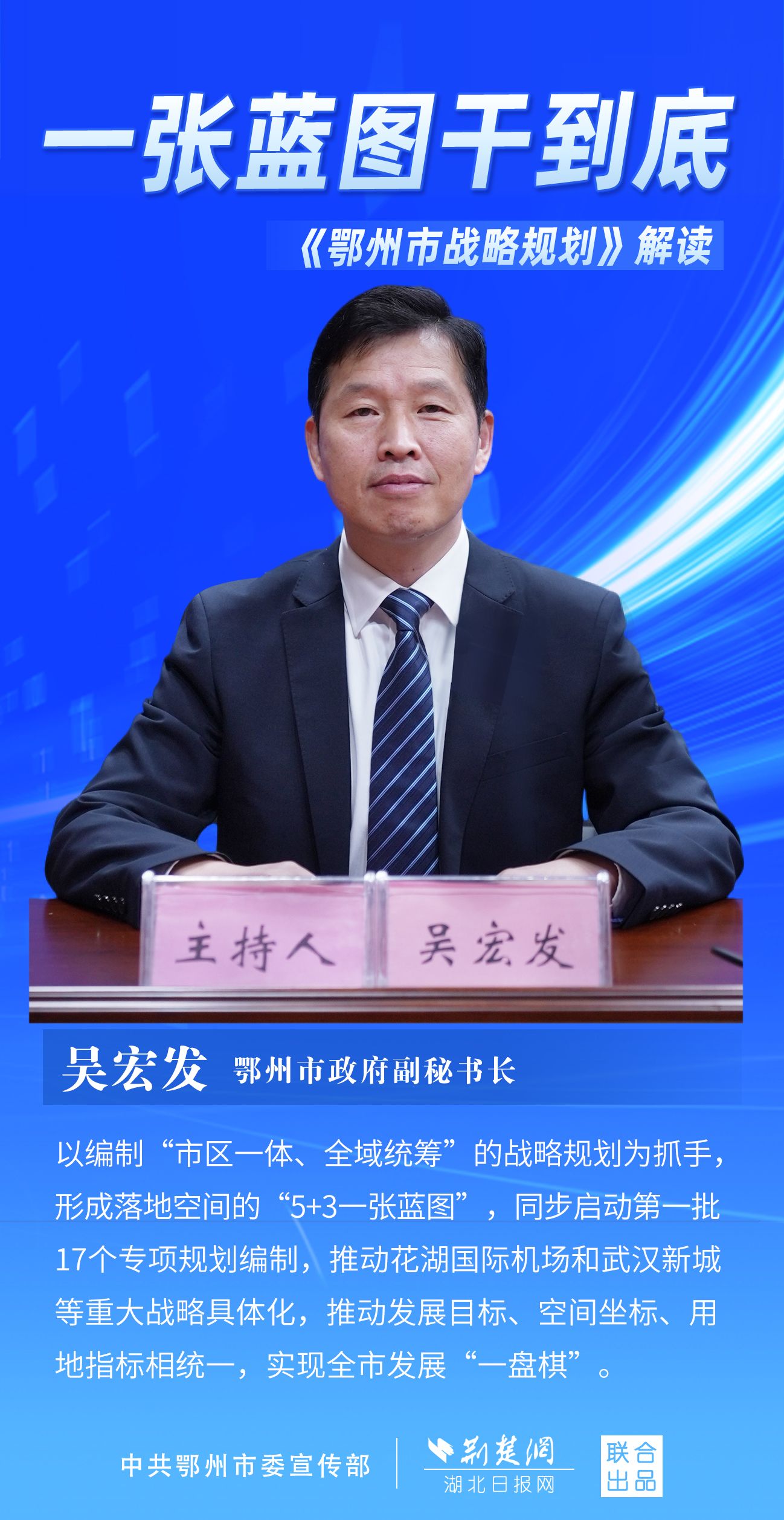 荊楚網(wǎng)(湖北日?qǐng)?bào)網(wǎng))訊(記者 劉璐、金康 通訊員 胡彥)11月7日上午,鄂州市召開(kāi)新聞發(fā)布會(huì),宣布《鄂州市戰(zhàn)略規(guī)劃》即將印發(fā)實(shí)施。市委副秘書(shū)長(zhǎng)、市委政研室主任游惠民透露,從機(jī)制優(yōu)化、指標(biāo)考核、項(xiàng)目實(shí)施等方面確保規(guī)劃制度有依據(jù)、成效可考核、實(shí)施有抓手。具體如何落實(shí)落地?讓我們用一組海報(bào)解讀《鄂州市戰(zhàn)略規(guī)劃》。