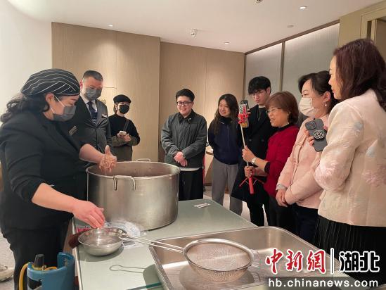 艷陽天酒店的黃燜圓子制作技藝是武漢市非物質(zhì)文化遺產(chǎn)。當(dāng)天,在艷陽天酒店大廚指導(dǎo)下,臺胞們學(xué)習(xí)制作炸圓子。他們戴上手套,將豬肉、魚茸等調(diào)制而成的餡料擠成丸子形狀,放入鍋中,待炸至金黃撈出,香氣四溢開來。