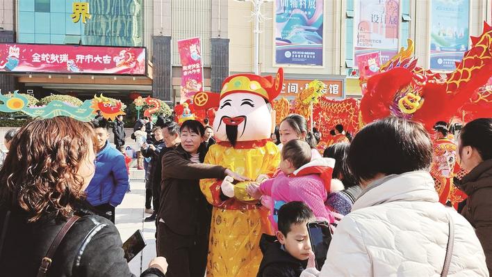 有攤主們還準(zhǔn)備了妙趣橫生的猜燈謎等互動小游戲,喜氣洋洋的“財神”則全場巡回互動,大人小孩們紛紛上前觸摸他懷中那碩大的“金元寶”,祈福新的一年福氣多多。