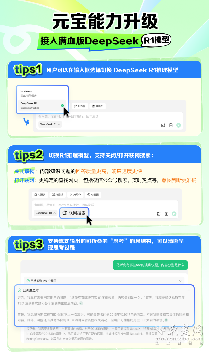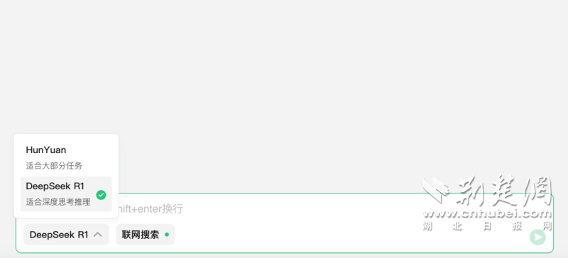 荊楚網(wǎng)(湖北日?qǐng)?bào)網(wǎng))訊(通訊員 袁軒)2月13日,騰訊AI助手“騰訊元寶”迎來(lái)重大更新,同時(shí)支持混元和DeepSeek兩大模型,打開(kāi)騰訊元寶并進(jìn)入對(duì)話界面,即可免費(fèi)使用DeepSeek-R1滿血版模型。