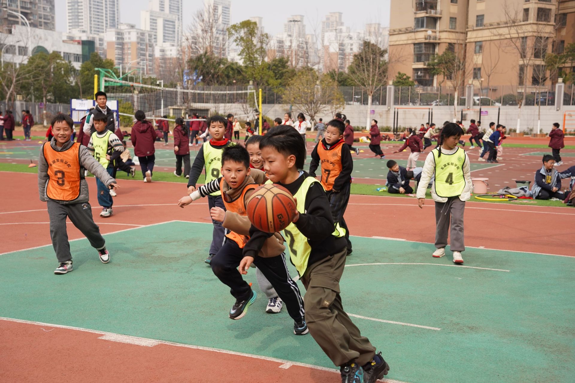 運球、突破、投籃……一場激烈的籃球比賽正在東湖實驗學(xué)校操場上進行,小球員們身著鮮艷的隊服,臉上洋溢著稚嫩卻堅定的神情。