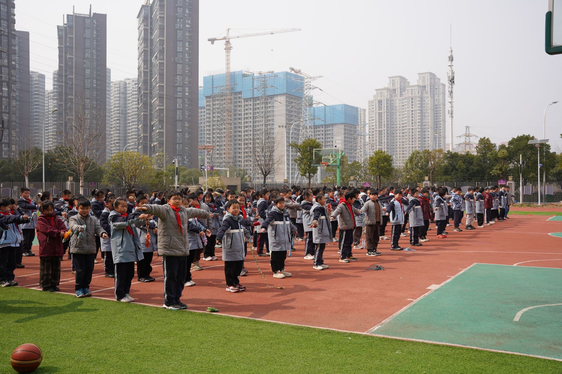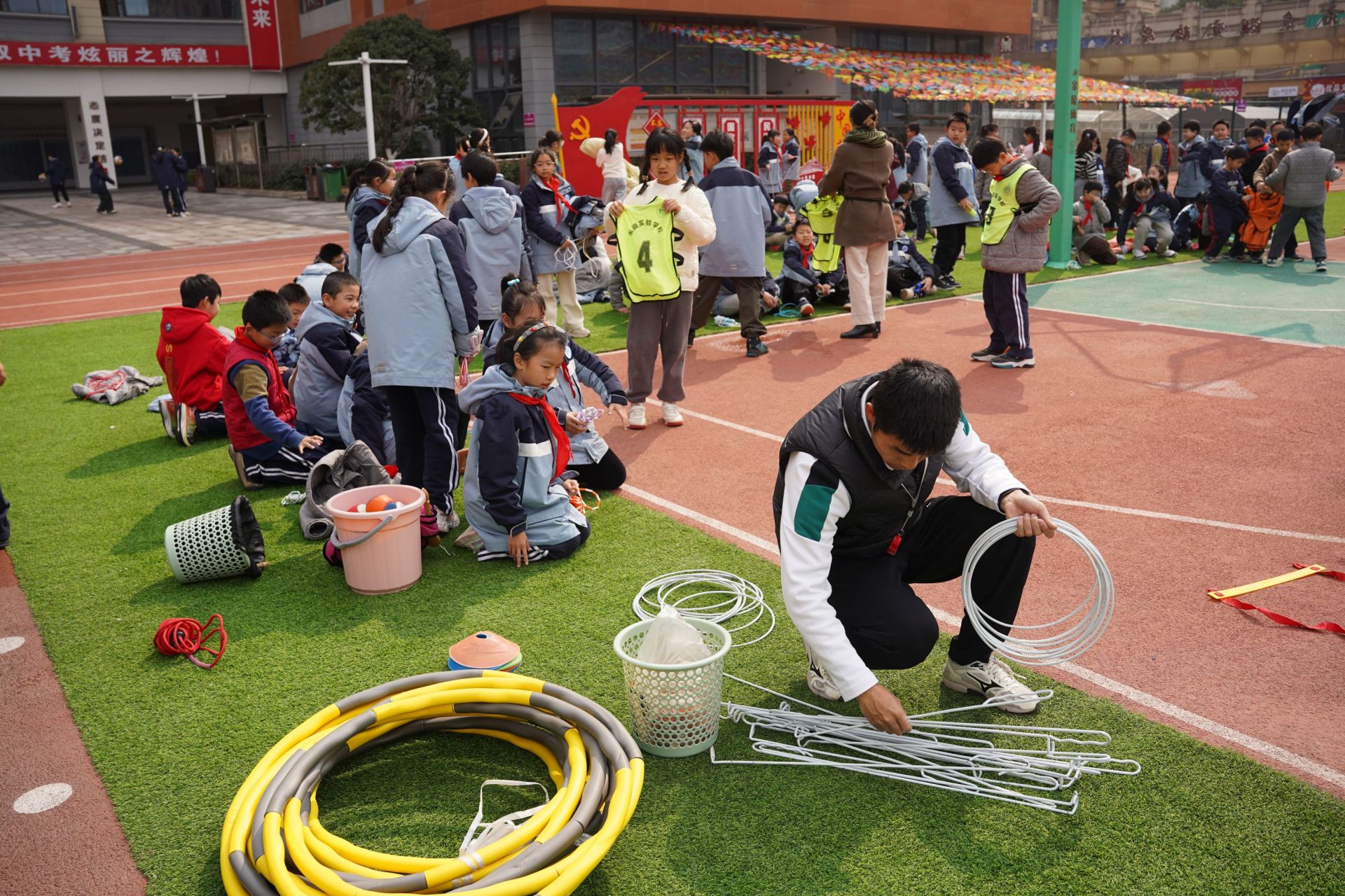 東湖實驗學(xué)校老師正在為大課間準備活動器具。張媛 攝