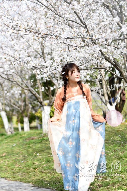 堤角公園園內(nèi)不少身著漢服、帶齊拍攝裝備的博主前來打卡拍照,將賞花美圖發(fā)布在社交平臺上,帶火“賞櫻”熱度。通訊員供圖