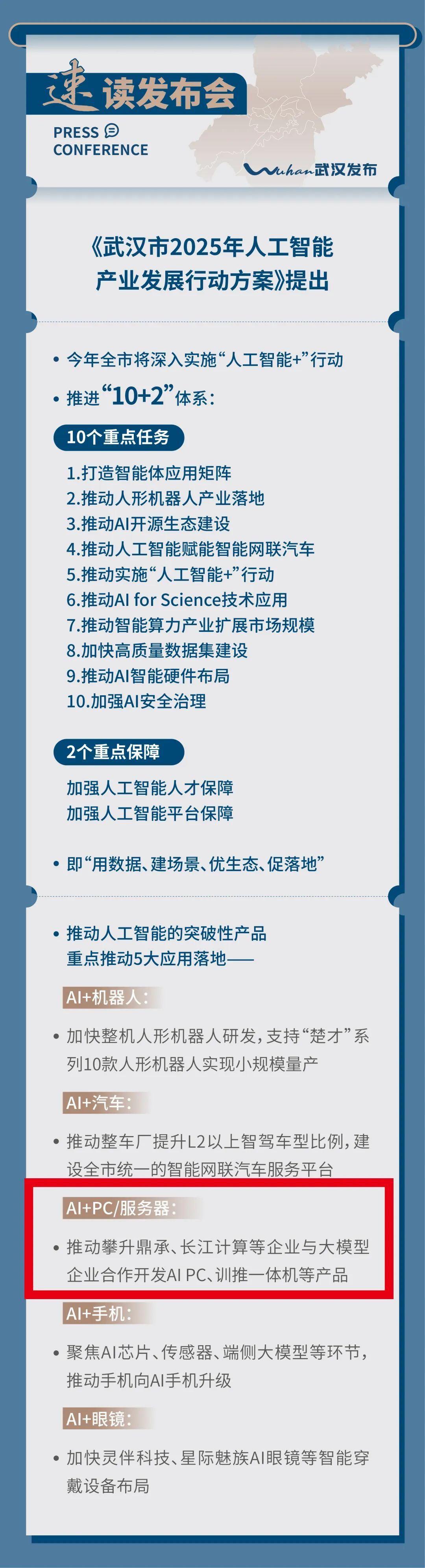 3月10日,《武漢市2025年人工智能產(chǎn)業(yè)發(fā)展行動方案》新聞發(fā)布會召開?!缎袆臃桨浮访鞔_將“AI+PC/服務(wù)器”列為推動人工智能的突破性產(chǎn)品,作為五大重點(diǎn)應(yīng)用之一予以落地,并點(diǎn)名支持攀升科技等企業(yè)聯(lián)合大模型廠商,攻關(guān) AIPC等產(chǎn)品。