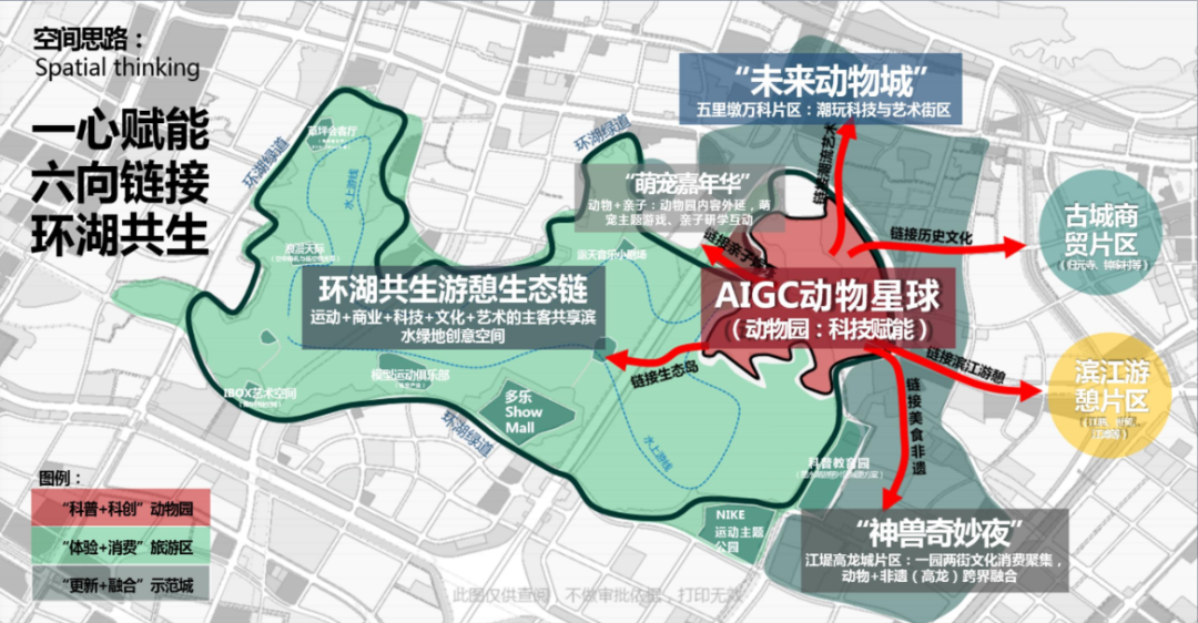 漢陽(yáng)區(qū)文旅局發(fā)布環(huán)動(dòng)物園文旅圈產(chǎn)業(yè)規(guī)劃,動(dòng)物園片區(qū)擬圍繞“親子、運(yùn)動(dòng)、創(chuàng)意”三大主題詞,通過(guò)數(shù)游賦能、延鏈補(bǔ)空、引線搭橋,整合區(qū)域商文旅資源,打造“科普+科創(chuàng)”動(dòng)物園、“體驗(yàn)+消費(fèi)”旅游區(qū)、“更新+融合”示范區(qū),形成“一心賦能、六向鏈接、環(huán)湖共生”的空間規(guī)劃思路。圍繞動(dòng)物園提升打造AIGC動(dòng)物星球,圍繞水路交通串聯(lián),豐富創(chuàng)意體驗(yàn)空間,形成環(huán)湖共生游憩生態(tài)鏈。讓環(huán)動(dòng)物園文旅圈形成“以文旅帶流量、以場(chǎng)景促產(chǎn)業(yè)”的引領(lǐng)效應(yīng)。