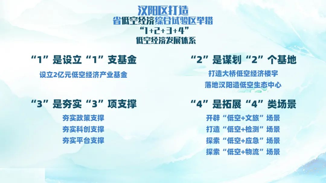 △漢陽(yáng)區(qū)發(fā)布打造省低空經(jīng)濟(jì)綜合試驗(yàn)區(qū)舉措,構(gòu)建“1+2+3+4”的低空經(jīng)濟(jì)發(fā)展體系。