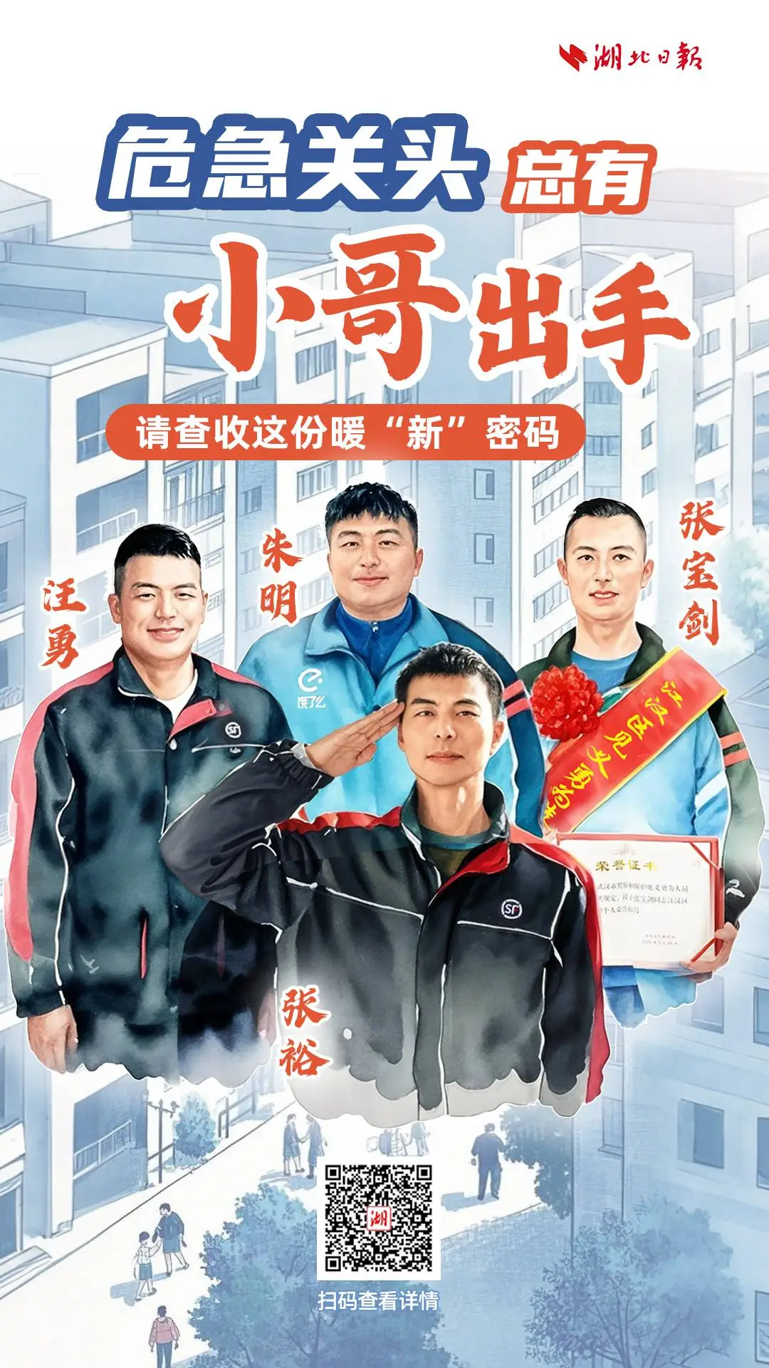 近些年來(lái),人們發(fā)現(xiàn),這個(gè)群體不僅是物流網(wǎng)絡(luò)的末梢神經(jīng),更成為群眾安危的守護(hù)者。很多人都知道這些故事:杭州外賣騎手彭清林12米高橋縱身躍江救人,溫州快遞員羅天友救人之后悄然離開,無(wú)錫李鯤鵬憑借職業(yè)敏感識(shí)破詐騙包裹。很多人也熟悉武漢的這些名字:“最美快遞員”汪勇,“火場(chǎng)英雄”順豐小哥張?jiān)?,帶領(lǐng)居民撲火的騎手朱明,用攜帶的自動(dòng)體外除顫器開啟緊急救人的張寶劍。