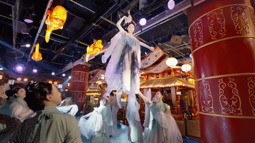 木蘭不夜城實(shí)景演繹、循環(huán)演出不間斷,噴火等絕技表演獲得了游客們的陣陣掌聲;《楚地長歌》花魁、茶鋪掌柜、店小二、浣紗女NPC街頭“飆戲”,吸引了游客朋友們互動(dòng)打卡,人氣火爆。