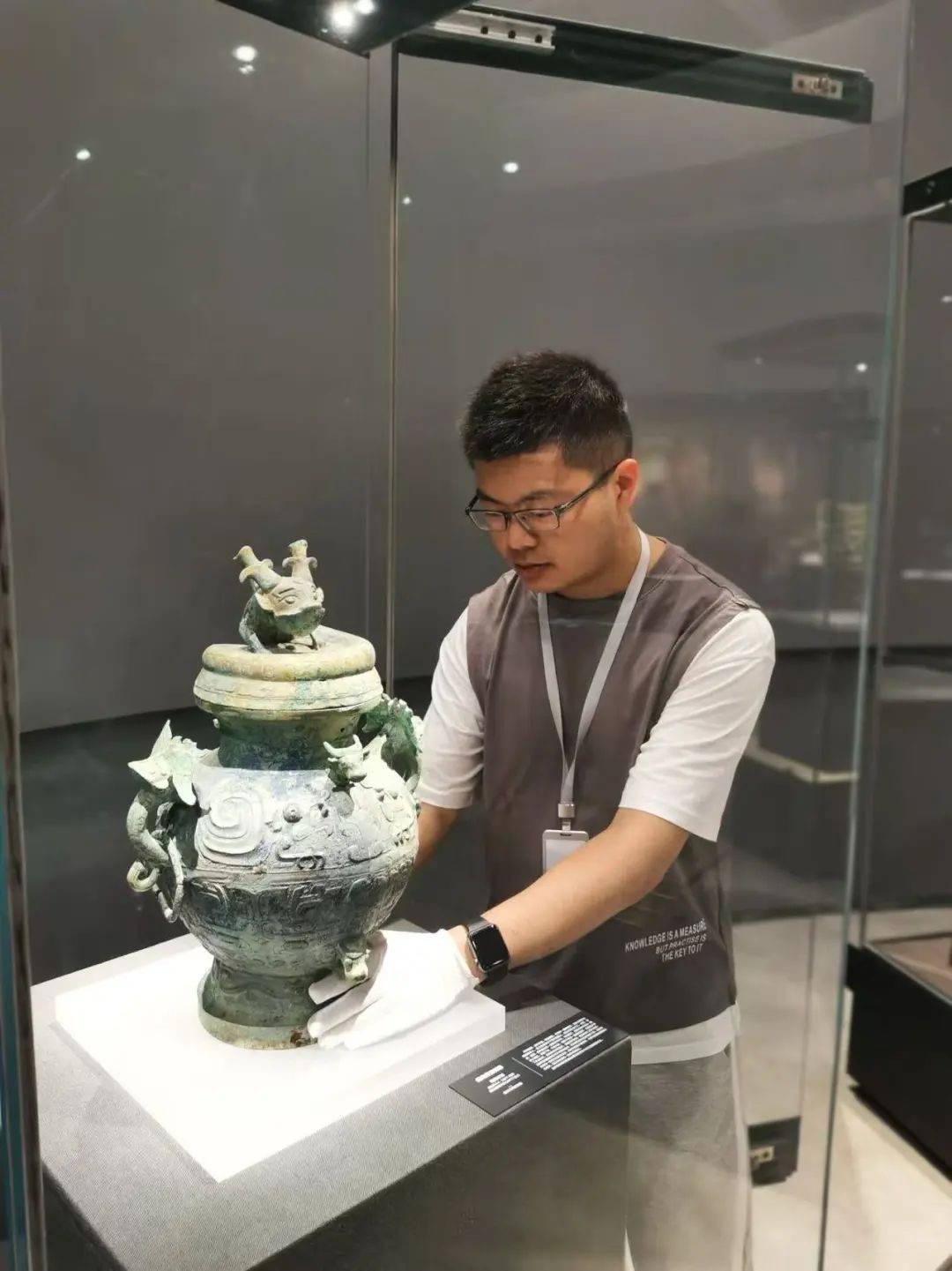 2021年6月,廖航在盤龍城遺址博物院開展“長(zhǎng)江萬(wàn)里青——長(zhǎng)江流域青銅器精品展”布展工作