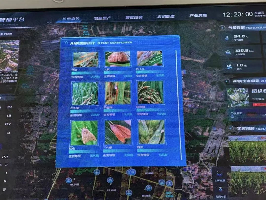 置身田間,每隔10畝地就佇立著一盞太陽(yáng)能滅蟲燈。農(nóng)場(chǎng)控制室的智慧大屏上,害蟲種類、病蟲害風(fēng)險(xiǎn)預(yù)警等信息一覽無余。