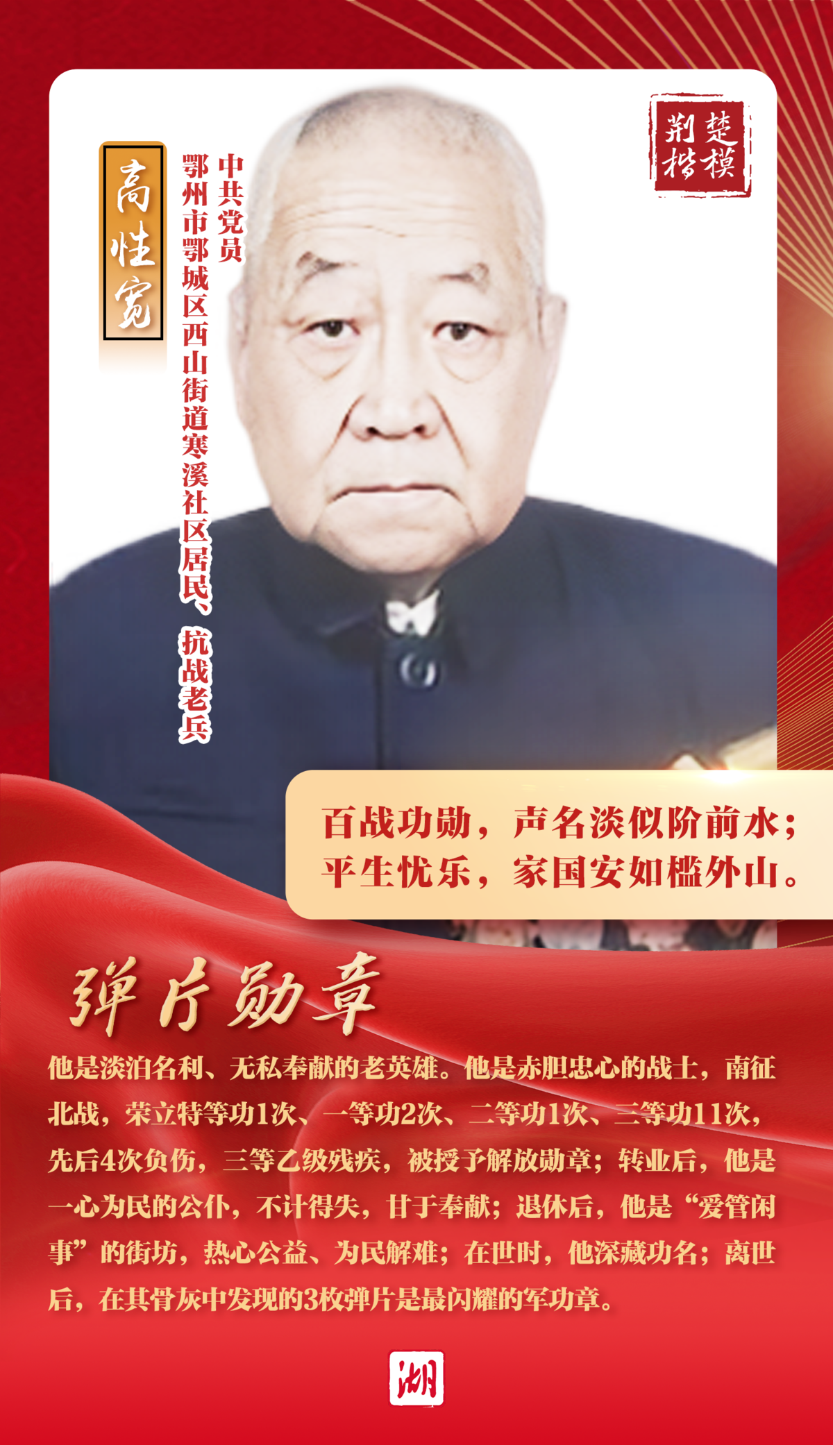 他是淡泊名利、無私奉獻(xiàn)的老英雄。他是赤膽忠心的戰(zhàn)士,南征北戰(zhàn),出生入死,榮立特等功1次、一等功2次、二等功1次、三等功11次,先后4次負(fù)傷,三等乙級殘疾,被授予解放勛章;轉(zhuǎn)業(yè)后,他是一心為民的公仆,不計得失,甘于奉獻(xiàn);退休后,他是“愛管閑事”的街坊,熱心公益、為民解難。在世時,他深藏功名;離世后,其骨灰中發(fā)現(xiàn)的3枚彈片是最閃耀的軍功章。