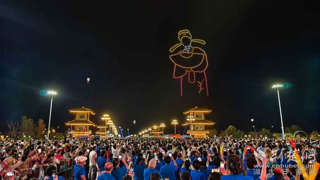 夜幕中,三百架無人機騰空而起,伴隨著悠揚的黃梅調(diào),在天空中次第變幻出黃梅戲服、“莫錯過”字樣等立體光影圖案,與兩岸璀璨燈光交織成一幅科技與藝術深度融合的絢麗畫卷,引來觀眾驚嘆連連。