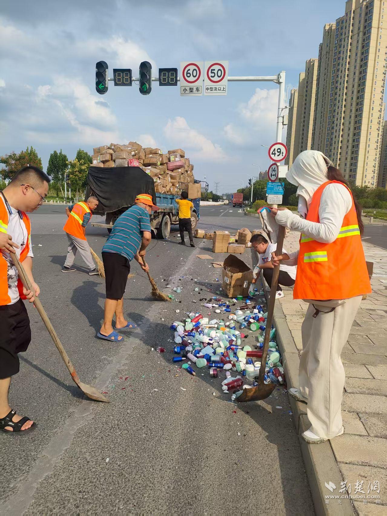 不到20分鐘,散落的貨物被清理干凈,路面恢復(fù)整潔?!罢娴奶兄x了!沒有你們幫忙,我一個(gè)人不知道要弄到什么時(shí)候,還可能堵車出事故?!必涇囁緳C(jī)連聲致謝,感嘆環(huán)衛(wèi)工人幫他解了燃眉之急。