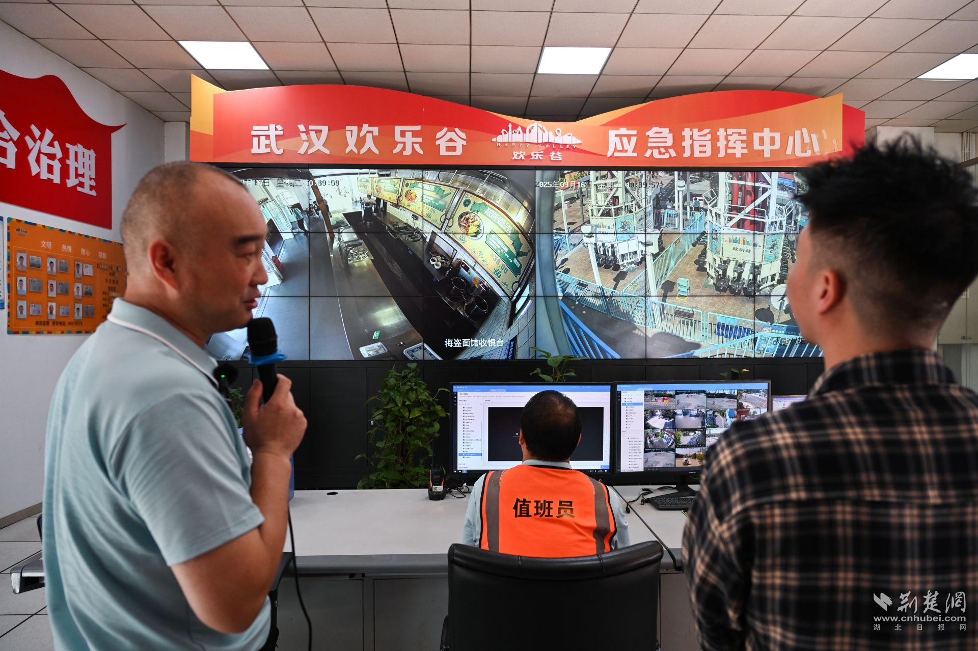 在武漢歡樂谷指揮中心,市民代表們目睹了數(shù)十個電子屏整齊排列,嚴密監(jiān)控著園區(qū)內(nèi)的各個角落。在這里,值班人員通過監(jiān)控設(shè)備的實時畫面,細致查看設(shè)備每日早檢及安全運營狀況,園區(qū)餐廳也借助智慧監(jiān)管平臺實現(xiàn)了透明化管理。