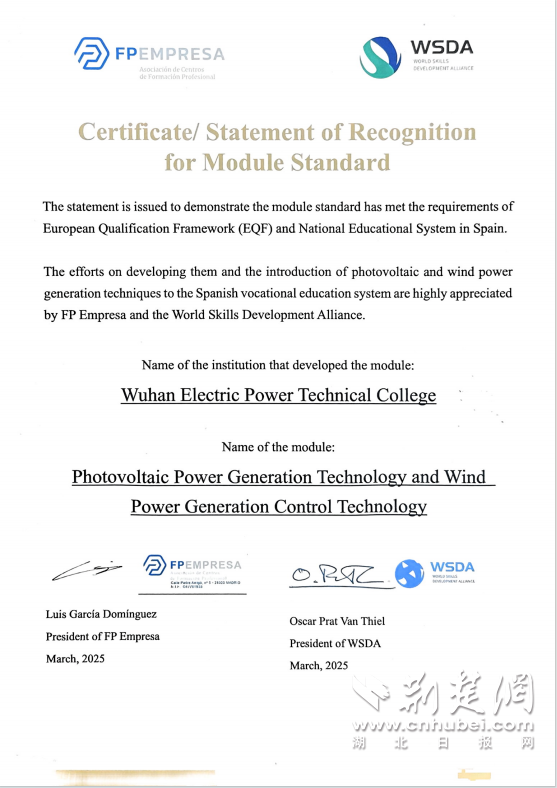 據(jù)了解此次是國內(nèi)電力類高職院校首次實現(xiàn)電力課程標準向歐洲國家的輸出,其價值不僅在于深化中西兩國在可再生能源職教領(lǐng)域的合作交流,更關(guān)鍵的是為中國電力技術(shù)“走出去”戰(zhàn)略提供了配套的技能人才培訓支撐,為國際電力產(chǎn)能合作量身打造出可復制、可推廣的“武漢電力職教方案”。