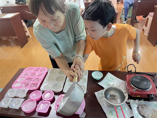 梅花苑社區(qū)居民動(dòng)手制作月餅手工皂。 通訊員供圖