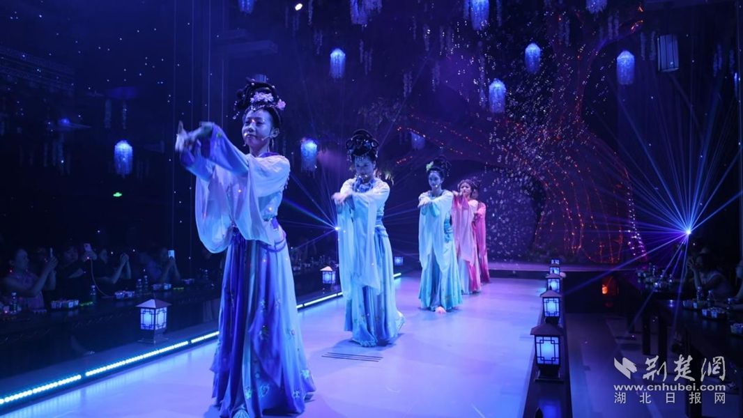 傳統(tǒng)文化的“破圈”還體現(xiàn)在味覺(jué)與視覺(jué)的融合中。黃梅戲主題餐秀綜合體“黃梅宴”內(nèi),新編劇目《天仙奇緣》與美食同步呈現(xiàn)。食客夾起黃梅魚(yú)面時(shí),舞臺(tái)上的“七仙女”便踏云步至席間,婉轉(zhuǎn)唱段與餐香交織,讓味蕾與聽(tīng)覺(jué)同時(shí)“入戲”?!霸緦?duì)黃梅戲不太了解,這場(chǎng)表演既有古典韻味,又充滿(mǎn)現(xiàn)代氣息,看得非常過(guò)癮?!笔忻袷V橛^演后贊嘆。