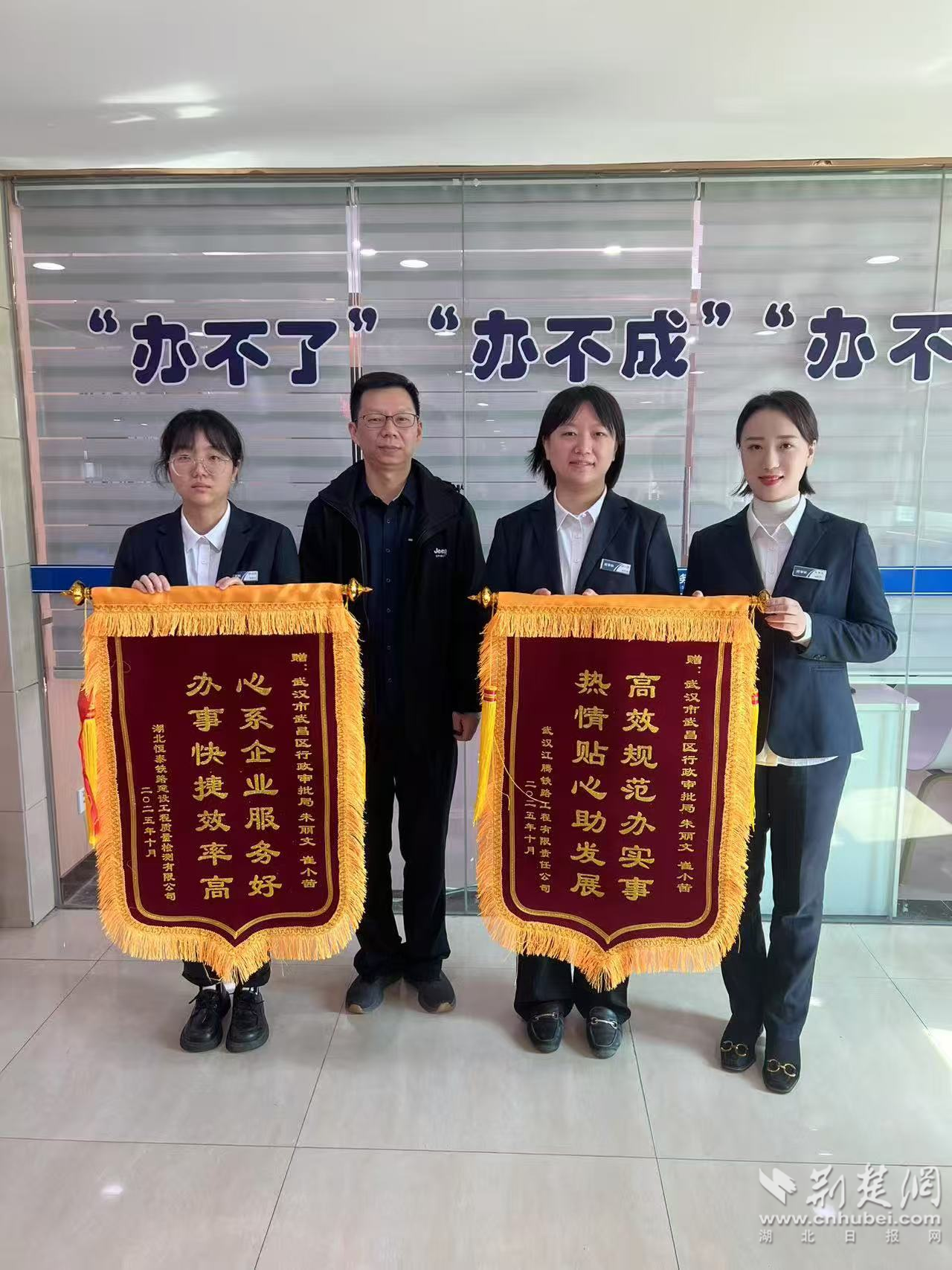 荊楚網(wǎng)(湖北日?qǐng)?bào)網(wǎng))訊(記者 李燕 通訊員 李永波 王金丹)10月24日,中國(guó)鐵路武漢局集團(tuán)旗下湖北恒泰鐵路建設(shè)工程質(zhì)量檢測(cè)有限公司、武漢江騰鐵路工程有限責(zé)任公司,順利辦結(jié)業(yè)務(wù)變更手續(xù)后,經(jīng)辦人董先生專程送來(lái)2面錦旗,向武昌區(qū)行政審批局工作人員表達(dá)謝意。