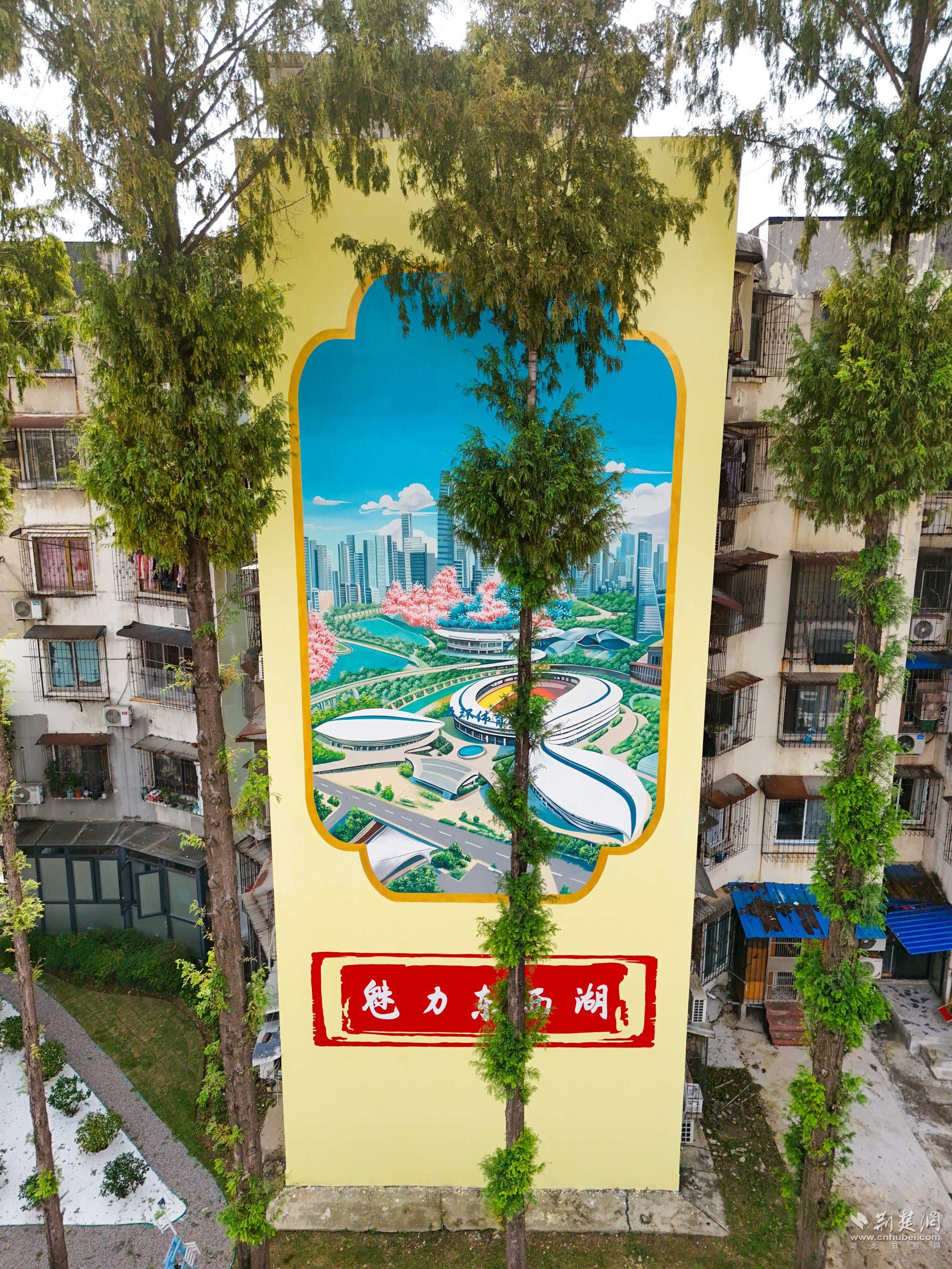 圍墻和彩繪也成了亮點(diǎn)。專業(yè)團(tuán)隊(duì)在相鄰居民樓外墻繪制325平方米主題壁畫(huà)——一面呈現(xiàn)“魅力東西湖”的城市風(fēng)貌,一面展現(xiàn)“幸福新常青”的生活圖景,成為社區(qū)新地標(biāo)。