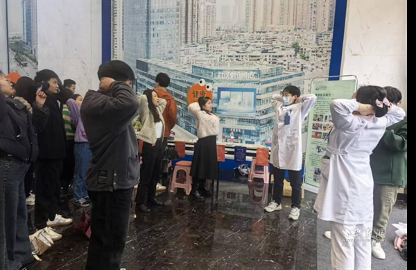 “健康驛站”區(qū)域,武昌醫(yī)院醫(yī)務(wù)人員為職工提供血糖血壓測量、頸椎腰椎檢查等服務(wù),現(xiàn)場教學(xué)健康操,指導(dǎo)大家利用工作間隙科學(xué)鍛煉、緩解疲勞。