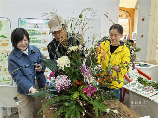 江岸區(qū)勞動(dòng)街道公園社區(qū)園藝師韋勝(中)現(xiàn)場(chǎng)演示菊花插花技藝。通訊員供圖