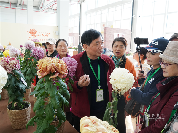 今年67歲的辛高爐擁有40多年菊花栽培經(jīng)驗(yàn),其培育的菊花品種與插花作品曾多次榮獲全國(guó)大獎(jiǎng)。他結(jié)合自己多年的養(yǎng)花心得,將菊花品種特性、造型技巧與養(yǎng)護(hù)要領(lǐng)娓娓道來,不僅吸引園藝師凝神傾聽,更引得沿途市民駐足圍觀。
