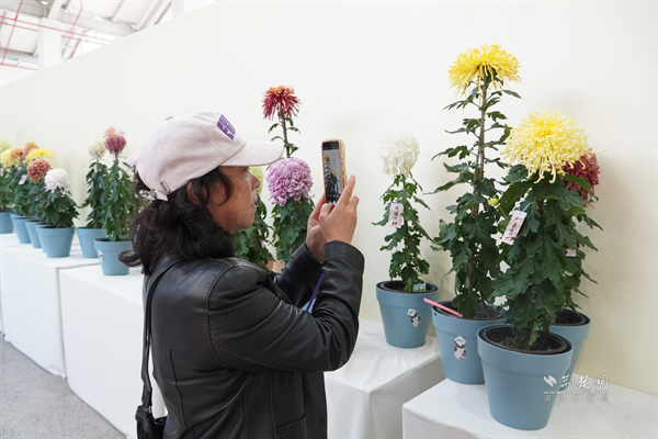 硚口區(qū)古田街道古二社區(qū)園藝師陳福英用手機(jī)記錄菊花品種。通訊員供圖
