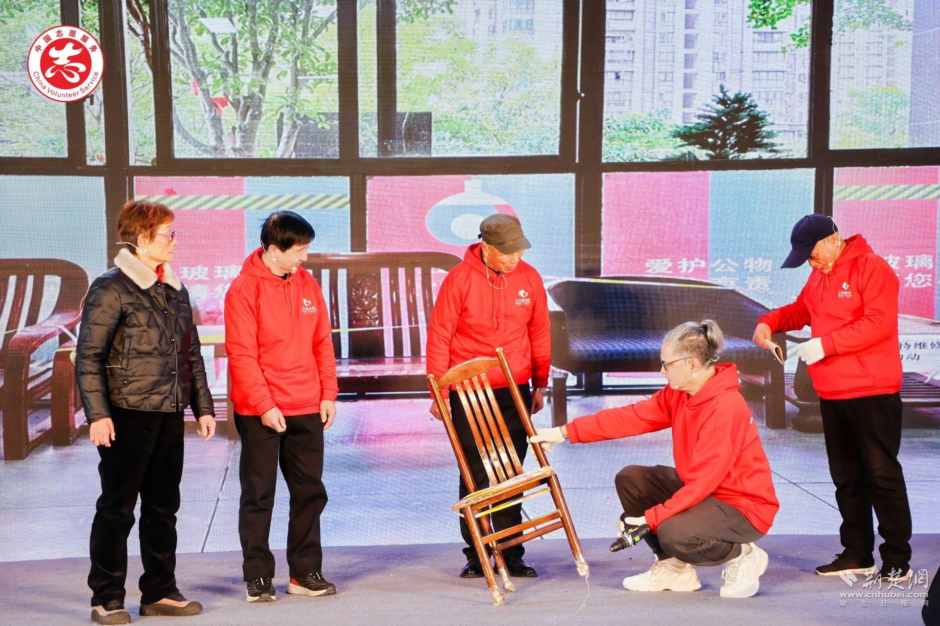 隨后的項目展演瞬間點燃氣氛,讓“專業(yè)力量+志愿行動”在舞臺上鮮活呈現(xiàn)。江漢里社區(qū)“煥新工坊”把舊家具的去處變成社區(qū)治理的創(chuàng)意源頭;“江城騎俠”則把藍騎士的每日配送延展為一張城市暖心網(wǎng)。作為第六屆“社志同行 益匯江漢”公益創(chuàng)投大賽的優(yōu)秀項目代表,兩支隊伍將真實場景搬上舞臺,讓志愿服務如何進入社區(qū)、推動治理創(chuàng)新,一目了然。