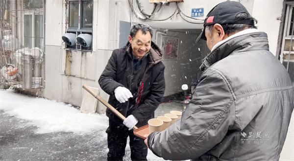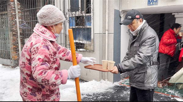 “大家歇一歇,喝點(diǎn)姜茶暖暖身子!”正當(dāng)眾人干勁十足時,一位黨員居民端著熱氣騰騰的姜茶走來,將暖茶遞到每個人手中?!拔壹依习橹匕Y需要照顧,沒辦法和大家一起出力,只能煮點(diǎn)熱茶讓大家暖和一下?!币槐?、一聲問候,凝聚起鄰里間最真摯的情誼,為掃雪行動更添溫情。