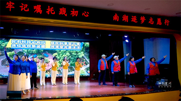 現(xiàn)場藝術節(jié)目精彩紛呈。情景劇《南湖暖陽》再現(xiàn)鄰里互助溫情,情景劇《華錦“民”星,微光閃亮》展現(xiàn)社區(qū)“民星”熱心服務,詩朗誦《以志愿之名書青春華章》寓意志愿服務遍地開花。這些節(jié)目讓感動在藝術共鳴中升華。