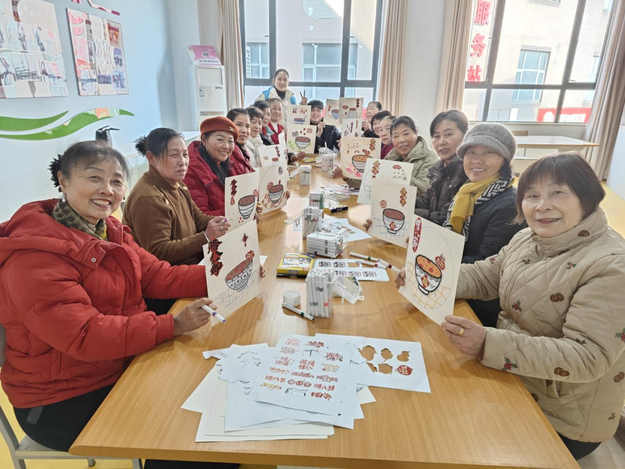 社區(qū)老年人活動中心內(nèi),老人們圍坐在一起體驗“溫情臘八”手工繪畫,在創(chuàng)作中增進鄰里情誼?!昂枚嗄隂]畫過畫了,今天好像回到了年輕時候!”74歲的李庭香老人舉著自己剛完成的《臘八團圓圖》笑著說道。