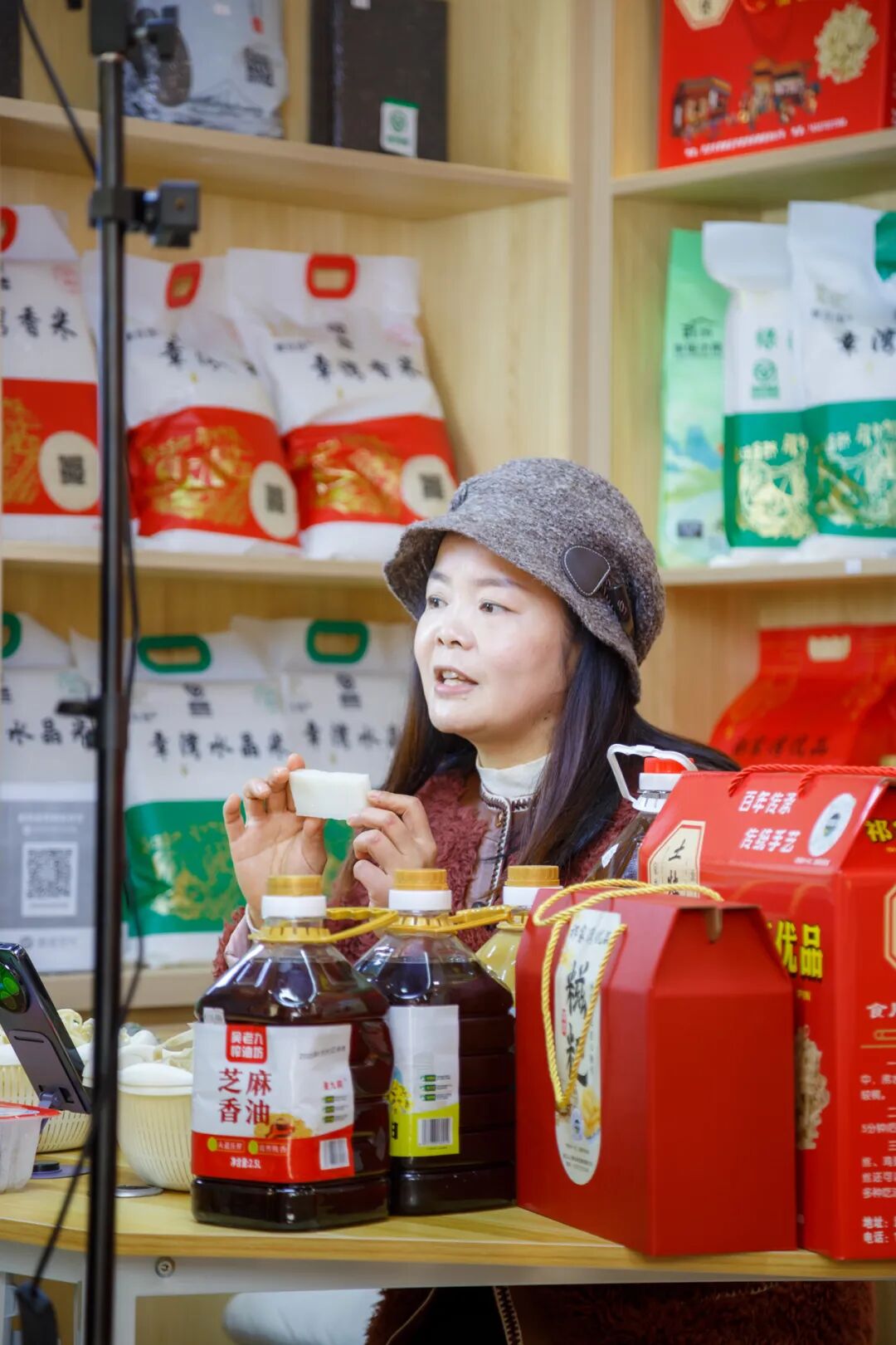 直播基地總面積達(dá)300㎡,是街道精心打造的綜合性農(nóng)業(yè)服務(wù)窗口,依托武漢云上耕農(nóng)業(yè)發(fā)展有限公司搭建的優(yōu)質(zhì)供應(yīng)鏈,匯聚了祁家灣及周邊十余家家庭農(nóng)場、合作社的二十余種特色產(chǎn)品——鮮榨菜籽油、優(yōu)質(zhì)大米等糧油調(diào)味,純散養(yǎng)土雞蛋、手工豆絲、風(fēng)干魚等特色農(nóng)產(chǎn)品,應(yīng)有盡有。