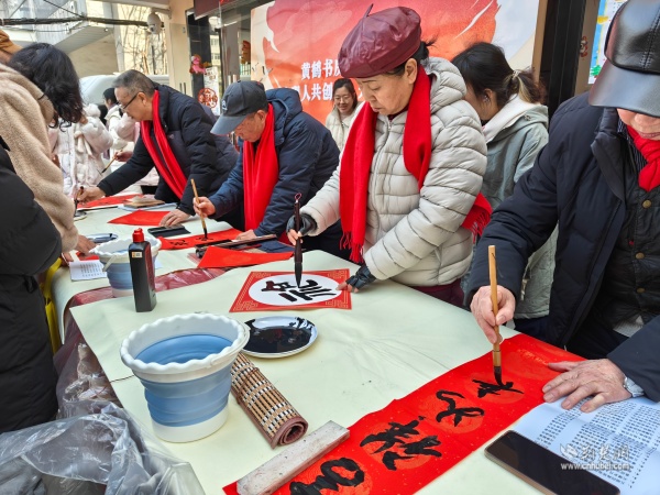 靜態(tài)的閱讀空間里藏著動態(tài)的文化活力。每周固定開展的書法研習(xí)、讀書分享活動中,總能看到老少讀者沉浸其中的身影。青少年圍坐桌前臨摹字帖,老年讀者在窗邊沉浸品讀,年輕父母攜娃共讀繪本,不同年齡層在墨香與書聲中和諧交流。春節(jié)期間,書房特邀首義書畫協(xié)會的老師現(xiàn)場揮毫,紅紙鋪展間,一副副滿載祝福的春聯(lián)、一張張寓意吉祥的福字被送到居民手中,讓文化關(guān)懷伴隨墨香走進千家萬戶?!笆謱懙拇郝?lián)更有溫度,墨香里都是社區(qū)的關(guān)懷。”居民李阿姨接過春聯(lián)時笑著說,她的話也道出了居民共同的心聲。