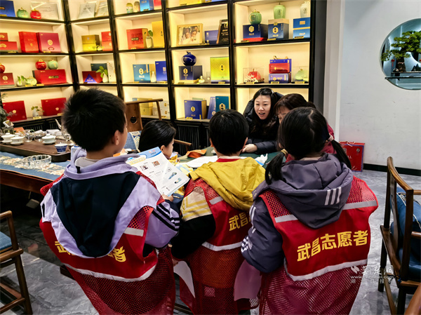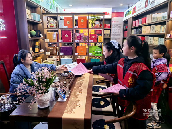來自樓宇托管班的十余名小學生,在志愿者引導下化身“小小安全宣傳員”。他們身著“紅背心”,手持禁鞭宣傳折頁和倡議書,分組走進陸羽茶都商鋪和人群聚集點,向商戶、顧客及過往市民講解煙花爆竹禁燃禁放的相關(guān)規(guī)定、潛在危害及環(huán)保意義,并分發(fā)倡議資料。