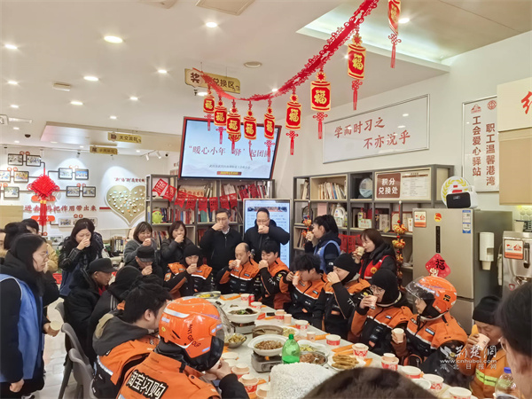 荊楚網(wǎng)(湖北日報網(wǎng))訊(通訊員 趙坤 童霞)2月10日農(nóng)歷小年,武昌區(qū)南湖街道工會聯(lián)合中央花園社區(qū)、寶安社區(qū)在南湖街新就業(yè)群體服務工會驛站開展“暖心小年,‘驛’起團圓”活動,邀請外賣小哥、快遞員、環(huán)衛(wèi)工人等20余名戶外勞動者歡聚一堂,寫福字、玩游戲、吃團圓宴,在歡聲笑語中,感受工會“娘家人”的溫暖。