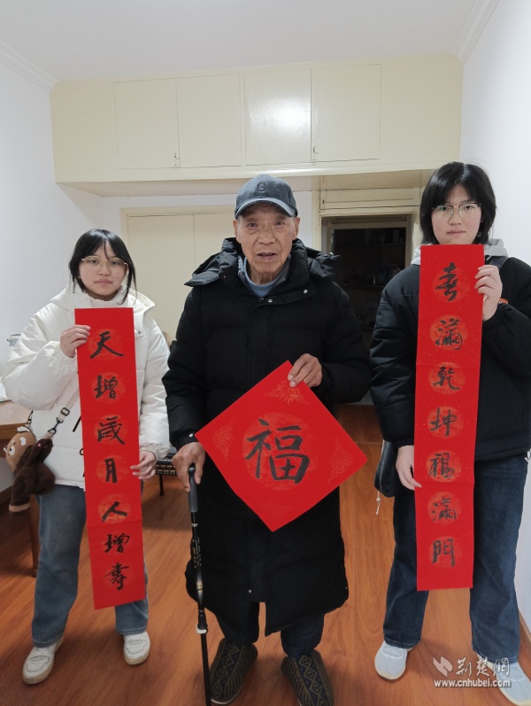 針對社區(qū)高齡、獨(dú)居老人,志愿者們開展“敲門行動”,走進(jìn)“鶴耋安”重點(diǎn)關(guān)愛對象家中。在88歲的李奶奶家門口,志愿者們將一副寫有“福壽安康”的春聯(lián)認(rèn)真貼好,紅紙金字映亮了老人的笑臉?!澳銈円粊恚依锞蜔狒[了,這春聯(lián)比買的還暖心!”李奶奶說道。每到一戶,志愿者們都送上手寫春聯(lián)與“福”字,幫忙排查水電隱患,陪老人聊家常、憶往昔,用陪伴驅(qū)散冬日的冷清。