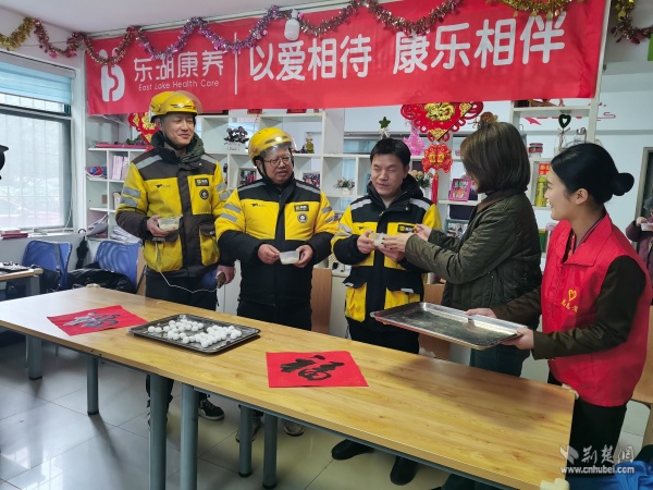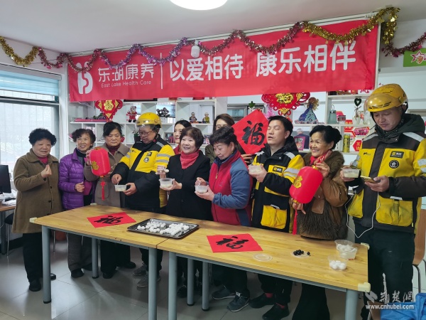 活動當天,讀書社區(qū)養(yǎng)老服務(wù)中心內(nèi)歡聲笑語、暖意融融。來自不同群體的志愿者們分工協(xié)作、配合默契,社區(qū)退役軍人服務(wù)隊的隊員揉面、拌餡有條不紊;武漢客運段的志愿者們手法嫻熟,搓圓捏餡一氣呵成;居民志愿者們則在一旁燒水備碗、忙前忙后。大家圍坐在桌前,一邊包著湯圓,一邊拉著家常,在裊裊升起的熱氣中,心與心貼得更近了。